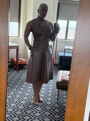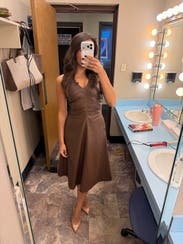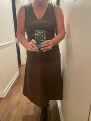 I love the brown and A-line cut. Highly flattering on me! My husband enjoyed my wearing it too. A+