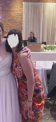 This dress was really a hit at the wedding I attended. I ordered a small and a med..ended up going with the medium due to the girls (36C)…def held them in better. Since the waist was a tiny bit bigger on the med, sitting lower on my back, I wasn’t able to wear my spanx…but the material was flowy and forgiving on my mom tummy! Also, can’t wear a bra..so the sticky petals were a must! Loved loved loved this dress—and so did everyone else!