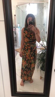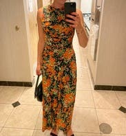 A great statement dress- could easily be dressed more casually but a hit for spring wedding season. Definitely skims the body and didn’t really hide tummy but was super flattering with the ruching! Could be longer- if you’re tall this might hit closer to mid calf.