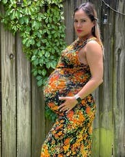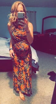 This dress is very stretchy and I ordered it because I had seen others wear this with a pregnant belly. It was very comfortable while at the same time looked very nice and made me feel glam especially after wearing sweats for some months! Here I was 20 weeks pregnant with my first. Pre-pregnancy XS/s size 24 denim. If renting again I would have ordered a size up but the 34 was the only size available at the time. Looked good, but a little more room and length would have been better