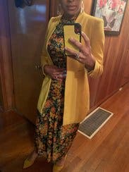 I tried to spring it up with yellow but you could wear it for fall too with darker colors. I loved this dress! It is on trend with the granny flowers! It was form fitting and had the flattering rousing throughout. Perfect for the hourglass shape!