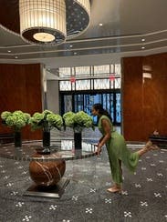Honestly really looked great. Dressed it up further with statement earrings. Material was great and traveled well in a suitcase. Has a tie back so size is adjustable. Felt great in it!