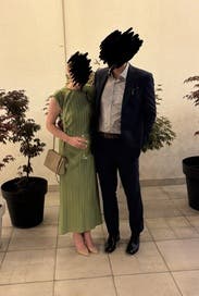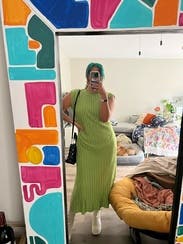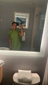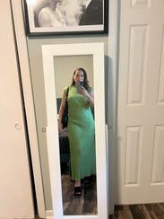Baby, this color is popping and although I would have liked a little snugger on the fit it was adorbs and I didn’t have to worry about my fupa. It was an elevated feel and look for even an informal lgbtqia work event at an art center. I would totally rent again. The looser fit worked and wasn’t given nightgown, loved it!