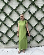 I can't say enough great things about this dress! The color is stunning, the pleating is gorgeous, the fabric is so light, but somehow never wrinkles through a full day of wear. I have a larger bust and it's so tough for me to find dresses I can wear a normal bra with / feel comfortable in. The strings in the back allow you to make this as form fitting or loose as you want to give yourself a nice shape, which was a huge plus.