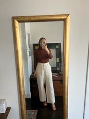 Didn’t end up wearing this top, it felt a bit stiff on and wasn’t super comfortable. The sleeves were reeeeally long. I’m usually okay with a Menlo gated sleeve but because the material was so stiff they didn’t scrunch how I would have liked. The color was nice though. Wouldn’t recommend, honestly.