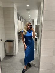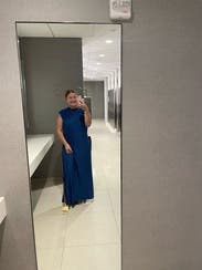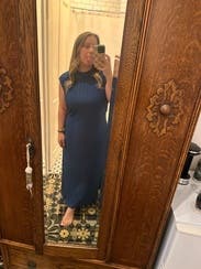 Beautiful color, nice length for me and very comfortable. Rented for a wedding and worked perfectly. It’s fairly loose fitting but I still wore shapeware underneath for a sleeker look.