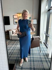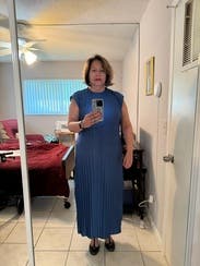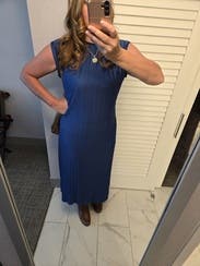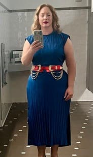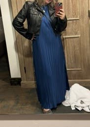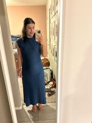 I loved the color and the style. It's a unique silhouette, but you can make it as snug or loose as you like. The material is not forgiving, so Spanxx was my friend. Wore it multiple times.