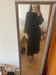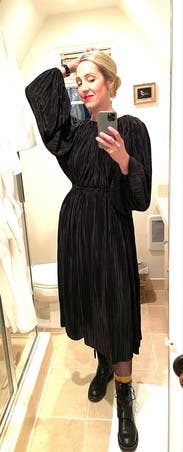 Nothing too exciting but if you're looking for an elegant black dress it's comfortable and chic. Waist is elastic and pleats also make it totally forgiving in terms of size. A little warm because of the synthetic material.