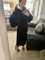 Wore this dress to two Thanksgiving parties, this dress is so flowy and beautiful! I expected it to be more velvety but it’s actually like a faux stretchy poly silk type fabric. I don’t think you should size up like a lot of reviews are saying, there’s some elastic at the waist that would’ve been much too tight if I sized down. If you’re afraid of a lot of fabric, don’t get this one, but I absolutely LOVE a fun silhouette so this was absolutely perfect for me.