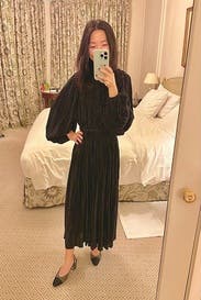 LBD but with character- the silky pleats and balloon sleeves give some interest to this dress