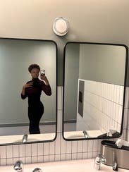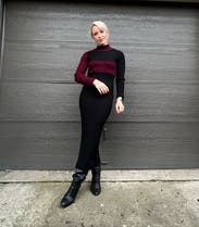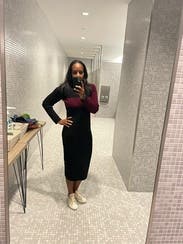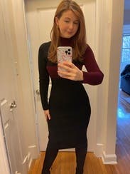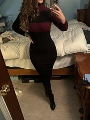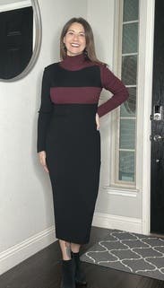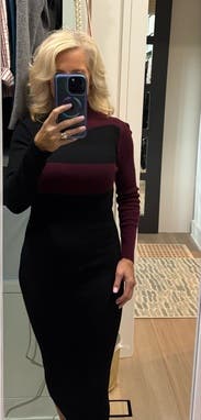 This dress fit me like a glove and I loved it! The deep burgundy and the color blocking created a beautiful silhouette. The quality of the knit is thick and forgiving.
