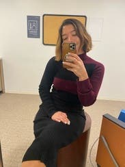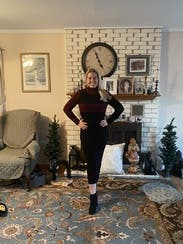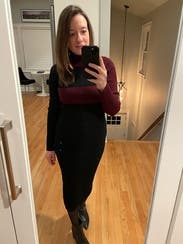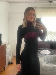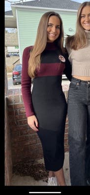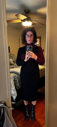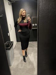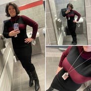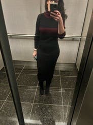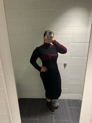 I love the color blocking on this dress. It was different than your typical black sweater dress, and the pop of maroon made it feel fall festive 🍂 It is a turtle neck and it is super WARM. (Don’t sit in the kitchen if you’re wearing this, rookie mistake made by me 😽) L fit well, the sleeves were a tad long - 4 stars would rent again!