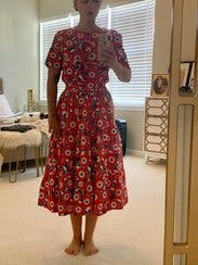I loved the color (cherry red rather than bright red, to my eye) and could have lived with the tiered skirt (not obvious to me in the photo) and the elastic waist but the short ties that sit just under the bustline were beyond me. They weren't long enough to tie at the back, or sit in a bow at my waist. No wonder the model has her hands clasped in front of her in the photo. Could have been such a pretty dress if the designer hadn't gotten carried away.