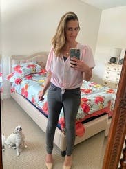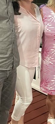 Really wanted to like this one but it is hard to style. I tried tucking it in with a pencil skirt, loose with skinny leggings, and landed on a little tie at the waist. The open front neckline is tricky too. I wish there was another button or it was a wide v-neck. I love the cotton candy pink color though. Maybe it will work for you!
