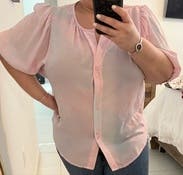 This is a cute top. I wore it open at the top with cami because the way the sleeves are sewn on whenever I lifted my arms it pulled and popped open. Fun rental but not for me
