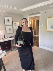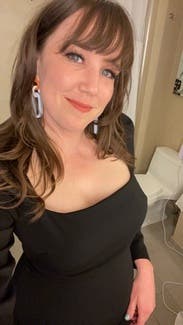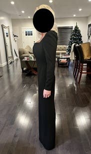 Beautiful black dress, simple and classic for almost any event. Badgley Mischka tends to run large so I always order a smaller backup if available. Normal size is 4 (5’3”/125lbs) but there was only a 4L available so I also rented the 2R. The 4L was long and was a bit looser than the 2R, which is what I ended up wearing. As you can see in the pic, the 2R was still long on me, even though I was in 4.5” heels, however fit better than my normal size. The dress has some give and is pretty comfortable. I did not need to wear a bra. Might buy this dress just to have as a wardrobe staple!