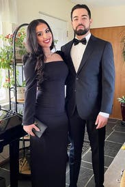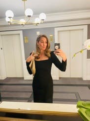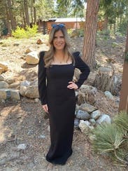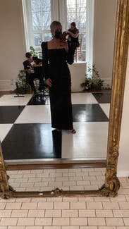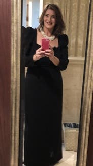 I wore this dress to a black-tie wedding. It was so beautiful and classy, with the perfect neckline—so flattering without it being too revealing! I’m 5’3 but did the L in length to be able to wear 4 inch heels and it was perfect. I had no complaints and received many compliments. Wooo!