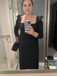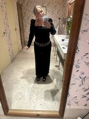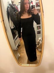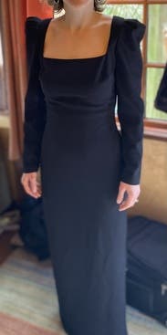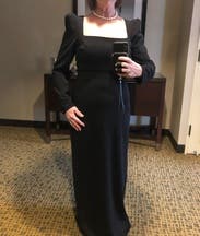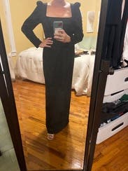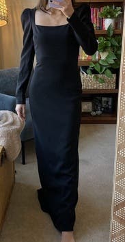 The good reviews on this dress did not let me down and I'm so happy that I ordered and wore it for a black tie professional event. I was worried that a long sleeve long black dress would be "matronly" but it wasn't. Square (and low cut) neckline and puffy sleeves were very flattering, as was the form fitting body of the dress. Follow the reviews and get this dress for fall/winter events.