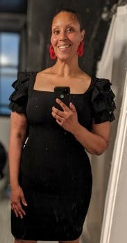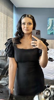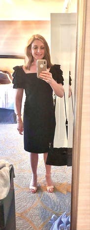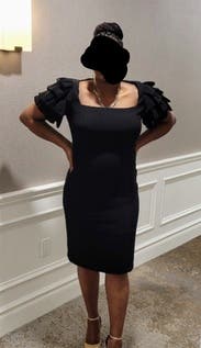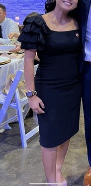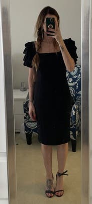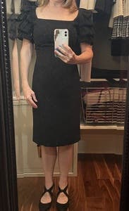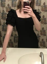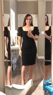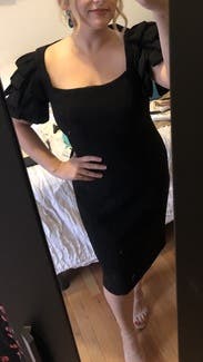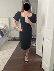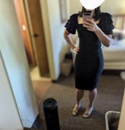 This dress is a stunner and I felt so confident! Runs true to size and fabric has plenty of stretch while still hugging the body and giving shape. Sleeves give it a fun twist on an otherwise simple LBD. Definitely recommend!!!