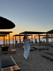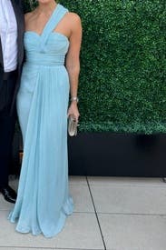 I wore this Badgley Mischka draped one-shoulder gown to a wedding in Greece, and it was absolutely amazing! The soft flow of the fabric and the beautiful color added such a special touch to the beach ceremony. The fit was perfect — I’m 5’4”, ordered a size 6R, and the length was just right (I was using high heels but I took them off for the picture). It was comfortable to wear all night and incredibly flattering. Truly the perfect dress for a destination wedding!