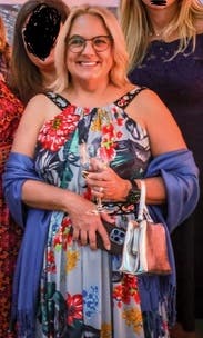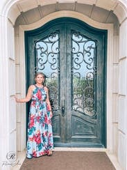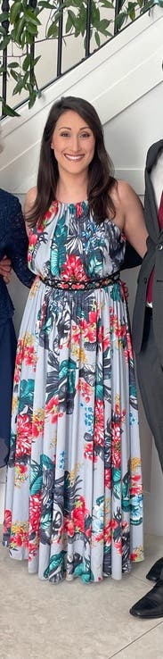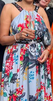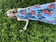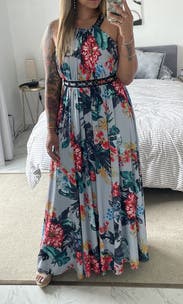 I love this dress. I received so many compliments in it both times that I've worn it now. So flattering. Flows like you are a goddess while you walk. Gorgeous colored flowers on top of the beautiful blue dress.
