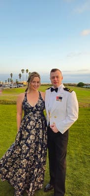 This was my first rental from RTR. Both the 6 and the 8 fit but I felt that the girls were more secure in the 8 and not busting out as compared to the 6. The cleavage was a little more than I’m accustomed to but I made sure to use fashion tape to keep things secure. I used a scarf to help me feel more covered. Tons of compliments on the dress. Even though I got my hair professionally done, everyone had only commented on the dress. I felt like a princess and haven’t felt that way since my wedding day. Highly recommend, especially for a Navy spouse/partner because the dress is Navy Blue and Gold. You can’t go wrong.