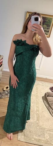 Green jacquard/brocade. 87% Polyester, 7% Silk, 6% Nylon). Gowns. Strapless. Sleeveless. Back zipper closure. Shoulder to hemline length: 59". Imported.