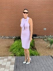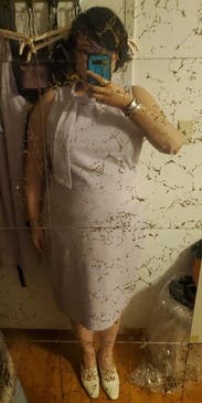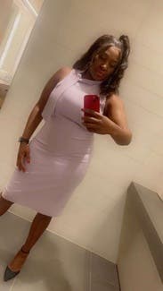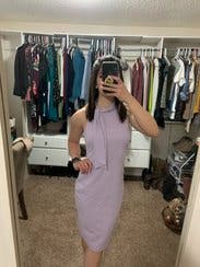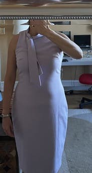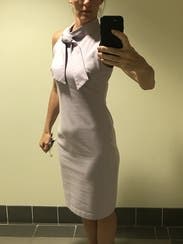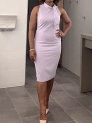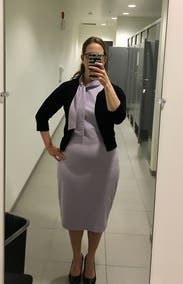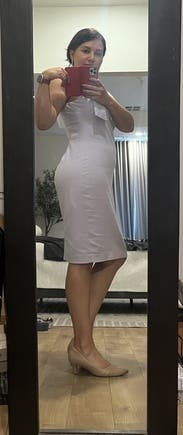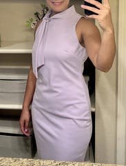 I wore this dress to work, and really loved the comfort and cut of it. Somewhat stretchy, very beautiful lilac color. I went up a size for comfort, I could've probably worn my normal size 10 with some spanx underneath and it wouldn't have looked so bunched up like in the photo. But I really enjoyed the dress, very beautiful!