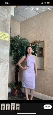I love the way badgley mischka fits, and this was no exception. I am on the tall side and this hit right at the knee. The color was a beautiful light purple and the fabric was a quality medium-weight fabric. I would have given it 5 stars, but the garment was pretty worn - the slit in the back was torn and the fabric showed signs of serious wear. Still happy I rented it, but RTR should probably take it out of the rotation fairly soon.