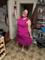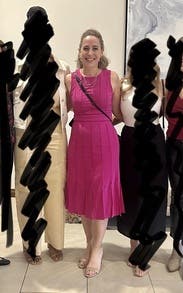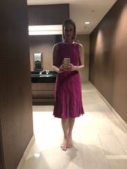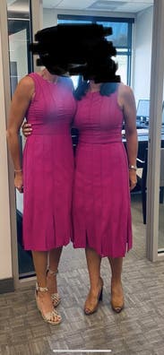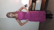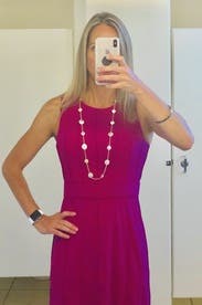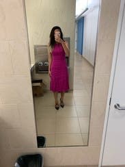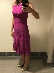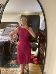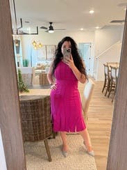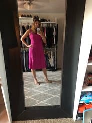 This dress was very cute but I just didn't love the material or the flappy ends. The color is a true magenta and it is very stretchy. A bit tight in the chest so you may need a helper to get the zipper up. Overall would wear for a different occasion but I ended up wearing my backup style for this.
