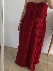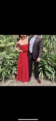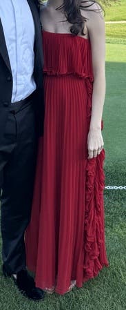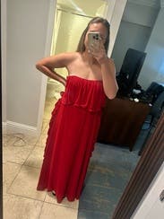 This is a REALLY beautiful dress. The red is bright and eye catching. The ruffles are very forgiving and the flow feels super luxurious and fancy. The less than flattering parts: I was tugging to pull it up every 10-15 minutes or so and it was incredibly long considering I was wearing 4/5 inch heels. I could have potentially gone down a size but wasn’t sure that would have been the most comfortable option. Overall, super pretty and the dress stands out on its own with many accessories.