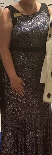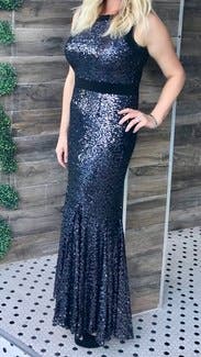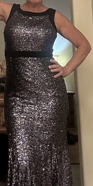 I am between size 10-12 and wore the 12L as the fit was a bit better around the back. Loved the sparkle from the sequins and the long length for this tall lady. Received many compliments and the dress was super comfortable for a night of dancing!