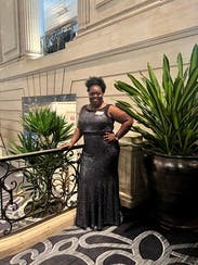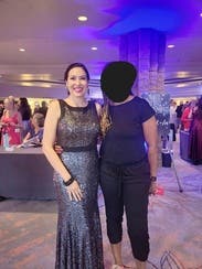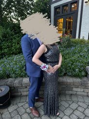 The color of this dress is very pretty, perfect for a formal event. (Rented prior to weight loss).