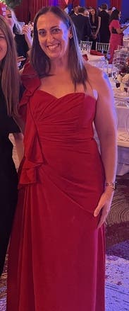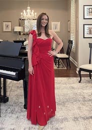 Vibrant gown with flattering ruffle detail. Good length with 2-3” heels. A little scratchy under the arms. Could have done a size smaller. Would rent again!