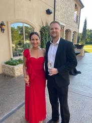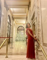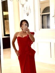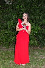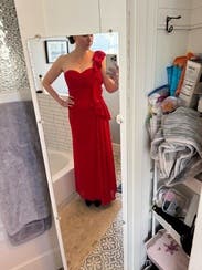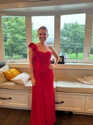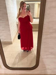 Beautiful high quality red dress - wore to a wedding. I received so many compliments on the color and style! It's definitely a lot of material, but was able to comfortably dance and enjoy the evening!