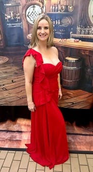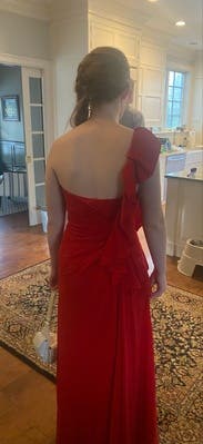 Perfect dress for any formal affair. The dress is long so heels are needed. Great material and the color is the perfect shade of red.