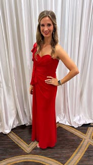 Badgley Mischka's gorgeous one shoulder ruffle gown flaunts a sweetheart neck and one-shoulder design in a brightly hued poppy red.