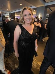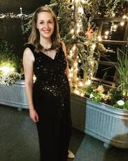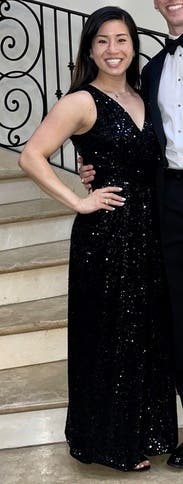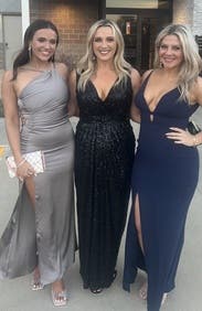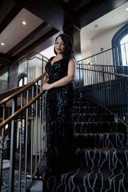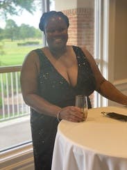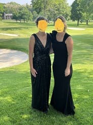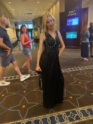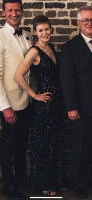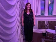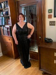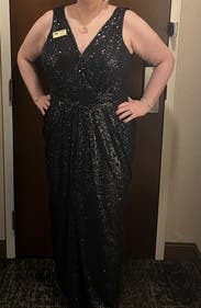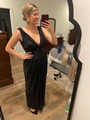 Love the halter neckline. Perfect black dress for formal event with the right amount of bling! (Rented prior to weight loss).