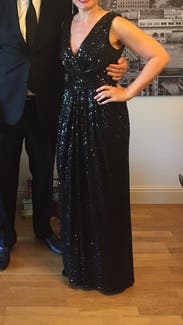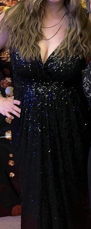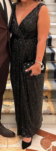 I wore this for a wedding anniversary and was so shocked at the amount of compliments I received! I usually wear simple and black silhouettes like this and the sparkle added an extra "umph". I had to use double sided tape to fit and secure around the bust but the length was perfect.