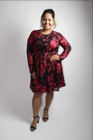 I love this dress so much. The flowers are in between a red & pink color - the dominant shade depends on the lighting. The style is very flattering as most fit & flare dresses are. I want to say it runs small in the bust but I've recently lost weight and only noticed the tightness when I added a padded bra to fill out the dress better & it's very slight. If you're above a 38DD, as my bra makes me, be wary on that. Size up. Everywhere else fit slightly too big on me, but I'm almost positive it's because I've lost weight rather than the actual fits problem! At that awkward .5 size right now & it'll be a few more months before that's changes. All in all, I feel gorgeous & sexy in a lowkey way. 5/5 will rent again. I assume it snags easily too as my rental has a few in the embroidery parts from previous renters.