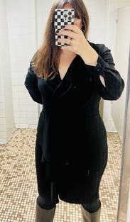 I wish I would have gotten a bigger size bc it hugged my curves a bit too much. The slit in the front is a bit high for work and the cleavage was too much too. It’s is great quality. Size up.