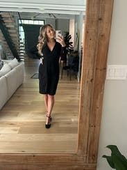 I wore this a couple of times- once for a work lunch and once for an evening reception after work. I love it. So well made and structured. As is always the case with a v-neck Badgely Mischka, I had to wear a cami underneath in order to make it work appropriate and keep the girls tamed. Love the fit- very forgiving in the waist.