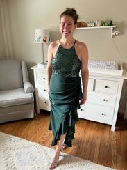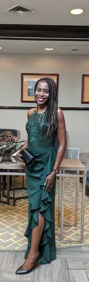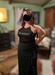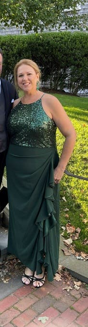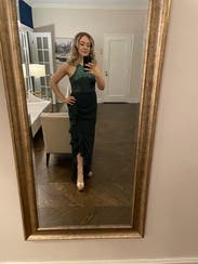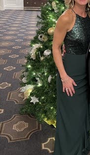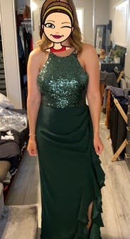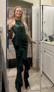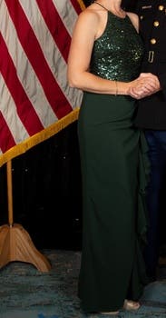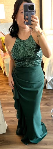 Loved this. Comfortable and felt great easy and comfortable to dance in with no worries. nice dark green color that stands out a bit but not too much perfect for me for a formal wedding. Ruffle side slit and fabric rouching completely concealed my little mummy tummy. Runs large (think bagdley mischka does in general compared to some designers) wore the 4R and it fit perfect. Perfect length for me (5’6”) with not too tall heels, no tripping or stepping on it.