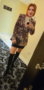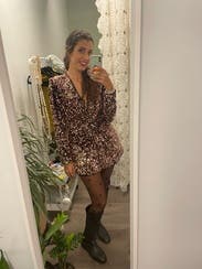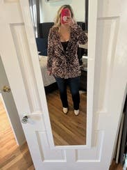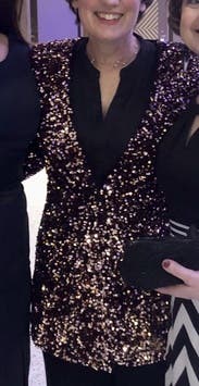 I wore this blazer on a girls' weekend in Vegas, and it was absolutely perfect for the occasion! The blazer has a fitted style, so I recommend sizing up if you prefer a looser fit or want to button it comfortably. It added the perfect touch of fun to my outfit, and I'd definitely rent it again for a special event!
