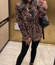 Beautiful sequin blazer, high quality. I wore out for a night in Vegas and it was perfect. Great fit for wearing open/on shoulders but would’ve been a little small if I wanted to button