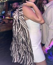 Zebra print is cute but it’s so sparkly. Fits snug across the shoulders.