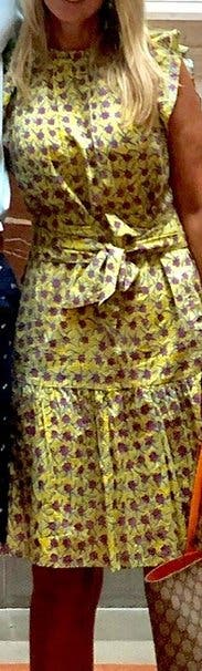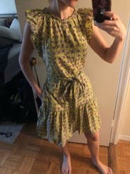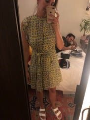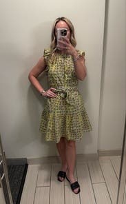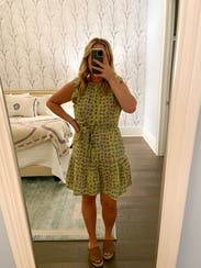 Loved the color, print, and fit of this dress. The ruffles up top add a nice feminine detail. I wore this dress on vacation in London and Ireland and wore once with wedges to slightly dress it up and then with flats to make it more casual during a the day. Many compliments!!
