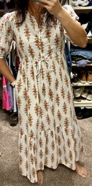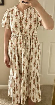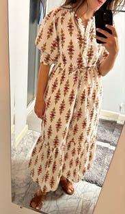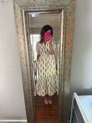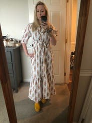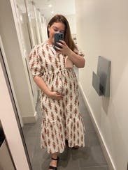 Really liked this dress. Was roomy throughout the whole dress, which was nice for my late-second trimester bump. The lining underneath is on the shorter end… something to consider because of this it may not work later in my pregnancy