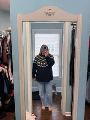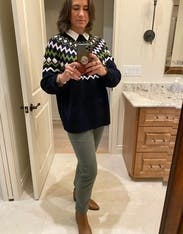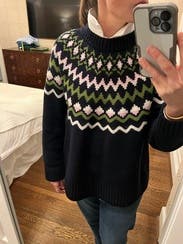 My girls loved this! Fun navy preppy sweater. Heavy so will keep you warm n cozy. Quality weave lots of versatility w this sweater. Great navy trousers for work or fun boots n jeans