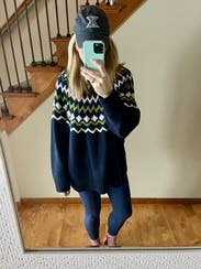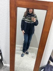 Cute look for a cold, rainy day. I could have sized down in this sweater. It was still cute. Oversized fit, if you want a closer for, size down.
